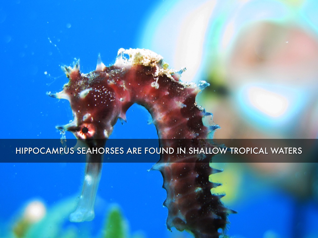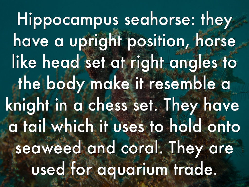 Hippocampus seahorse: they have a upright position, horse like head set at right angles to the body make it resemble a knight in a chess set. They have a tail which it uses to hold onto seaweed and coral. They are used for aquarium trade.