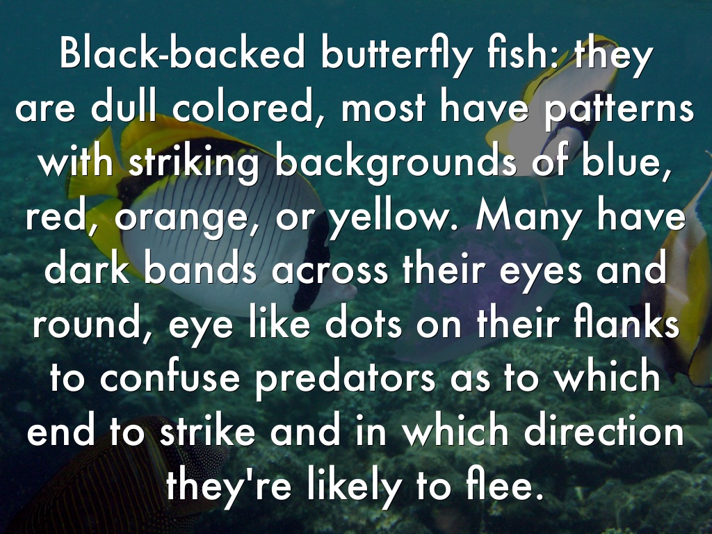 Black-backed butterfly fish: they are dull colored, most have patterns with striking backgrounds of blue, red, orange, or yellow. Many have dark bands across their eyes and round, eye like dots on their flanks to confuse predators as to which end to strike and in which direction they're likely to flee.
