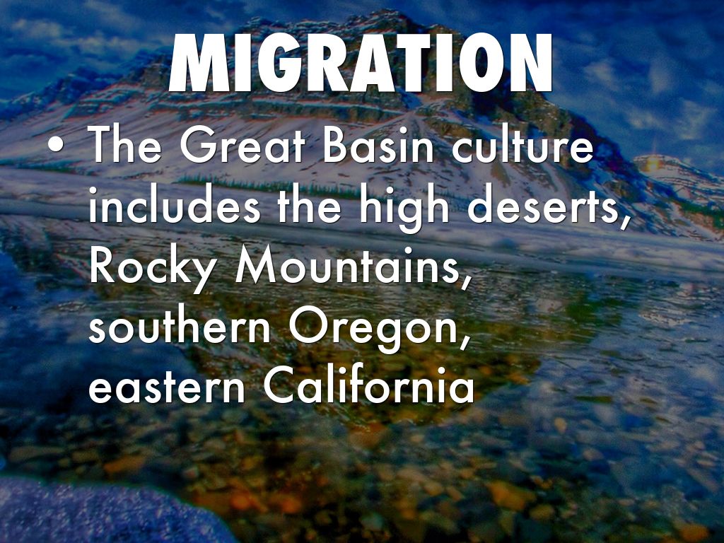 The Great Basin culture includes the high deserts, Rocky Mountains, southern Oregon, eastern California