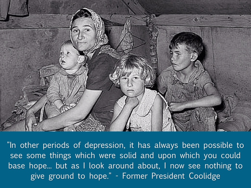 "In other periods of depression, it has always been possible to see some things which were solid and upon which you could base hope... but as I look around about, I now see nothing to give ground to hope." - Former President Coolidge
