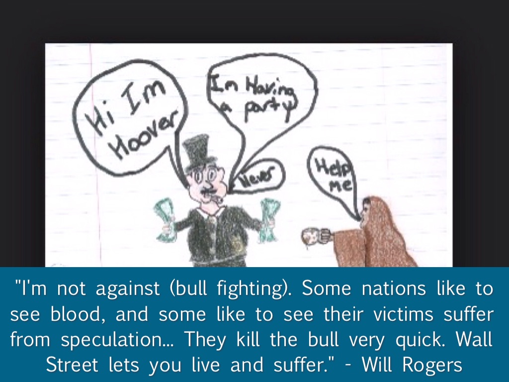"I'm not against (bull fighting). Some nations like to see blood, and some like to see their victims suffer from speculation... They kill the bull very quick. Wall Street lets you live and suffer." - Will Rogers