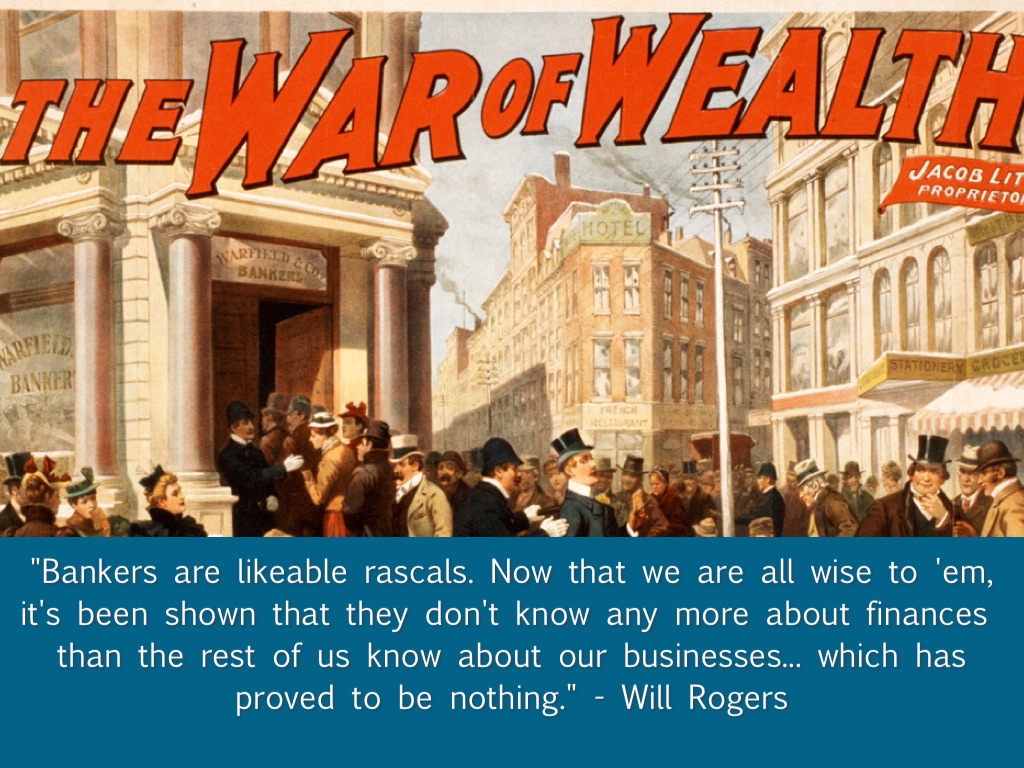 "Bankers are likeable rascals. Now that we are all wise to 'em, it's been shown that they don't know any more about finances than the rest of us know about our businesses... which has proved to be nothing." - Will Rogers