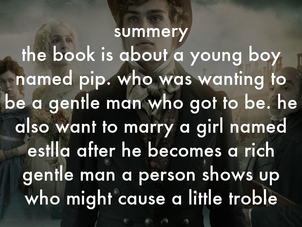 the book is about a young boy named pip. who was wanting to be a gentle man who got to be. he also want to marry a girl named estlla after he becomes a rich gentle man a person shows up who might cause a little troble