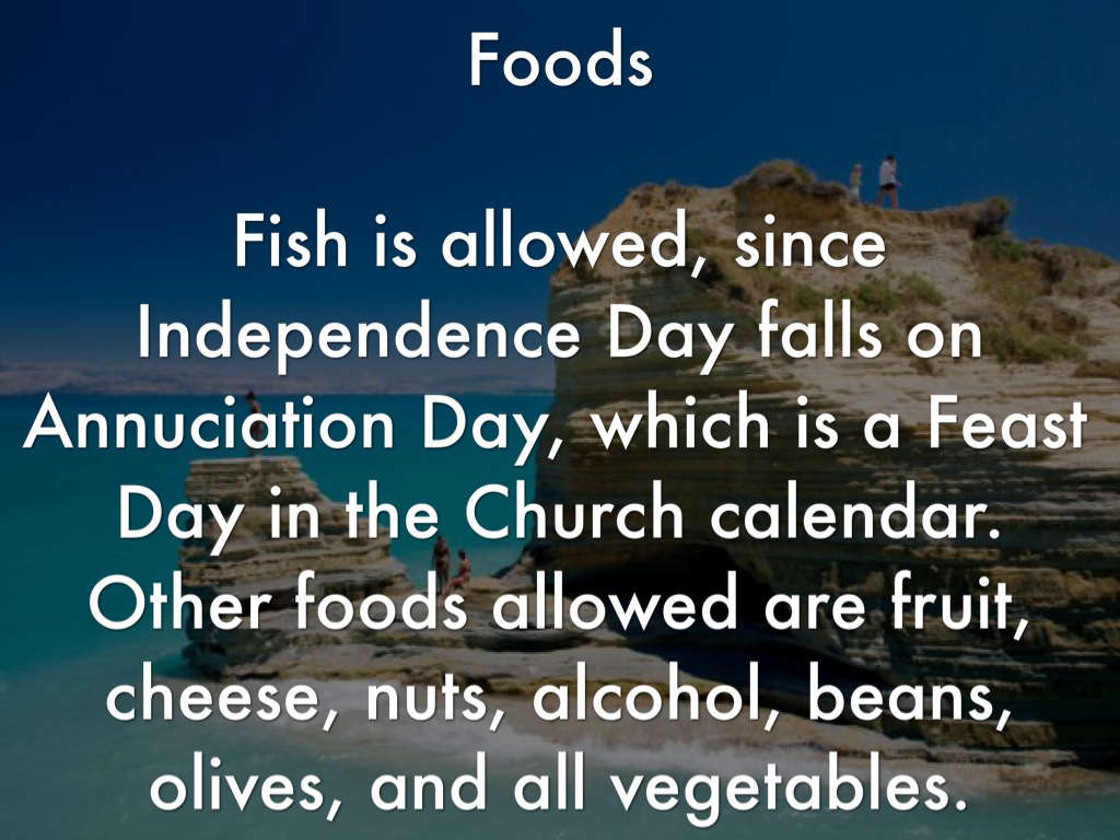 Fish is allowed, since Independence Day falls on Annuciation Day, which is a Feast Day in the Church calendar. Other foods allowed are fruit, cheese, nuts, alcohol, beans, olives, and all vegetables.