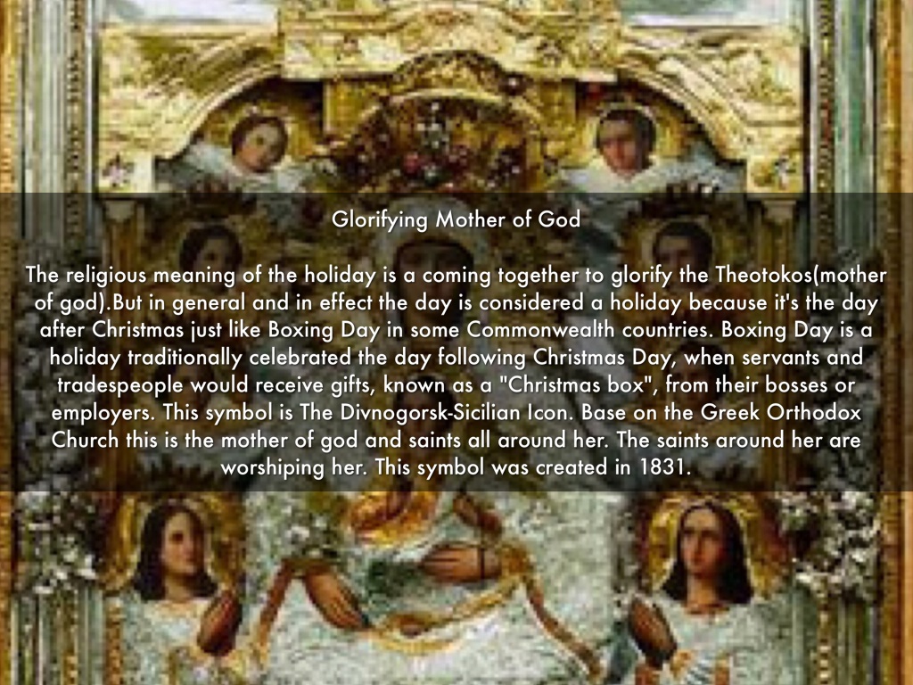 The religious meaning of the holiday is a coming together to glorify the Theotokos(mother of god).But in general and in effect the day is considered a holiday because it's the day after Christmas just like Boxing Day in some Commonwealth countries. Boxing Day is a holiday traditionally celebrated the day following Christmas Day, when servants and tradespeople would receive gifts, known as a "Christmas box", from their bosses or employers. This symbol is The Divnogorsk-Sicilian Icon. Base on the Greek Orthodox Church this is the mother of god and saints all around her. The saints around her are worshiping her. This symbol was created in 1831.