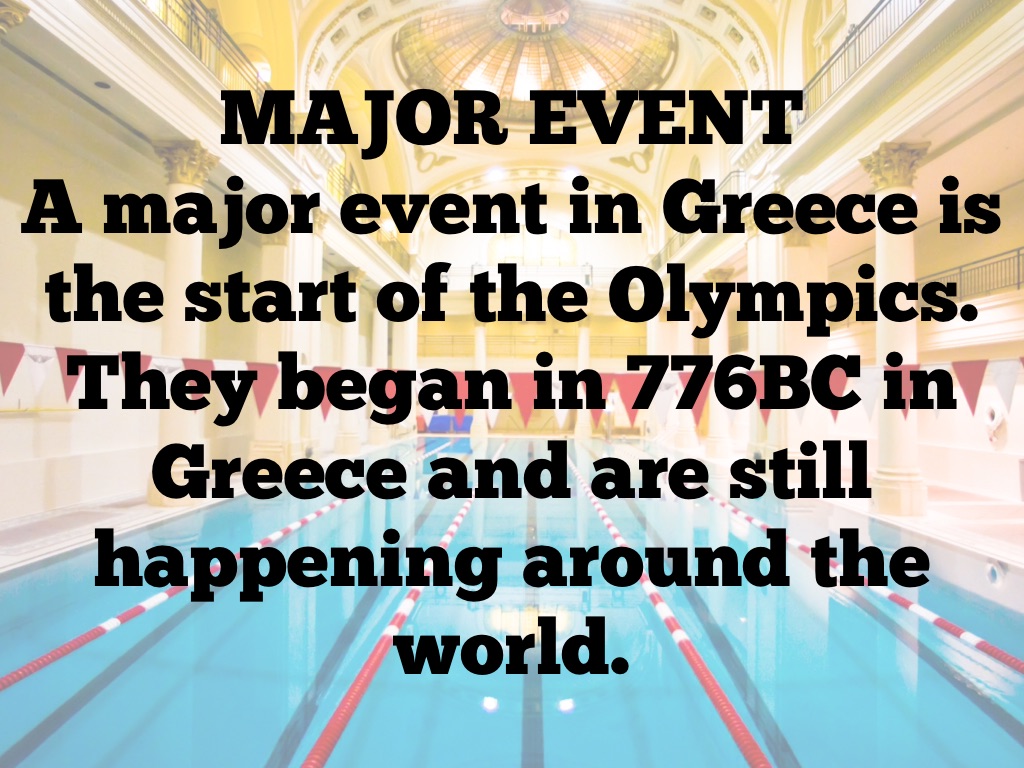 A major event in Greece is the start of the Olympics. They began in 776BC in Greece and are still happening around the world.
