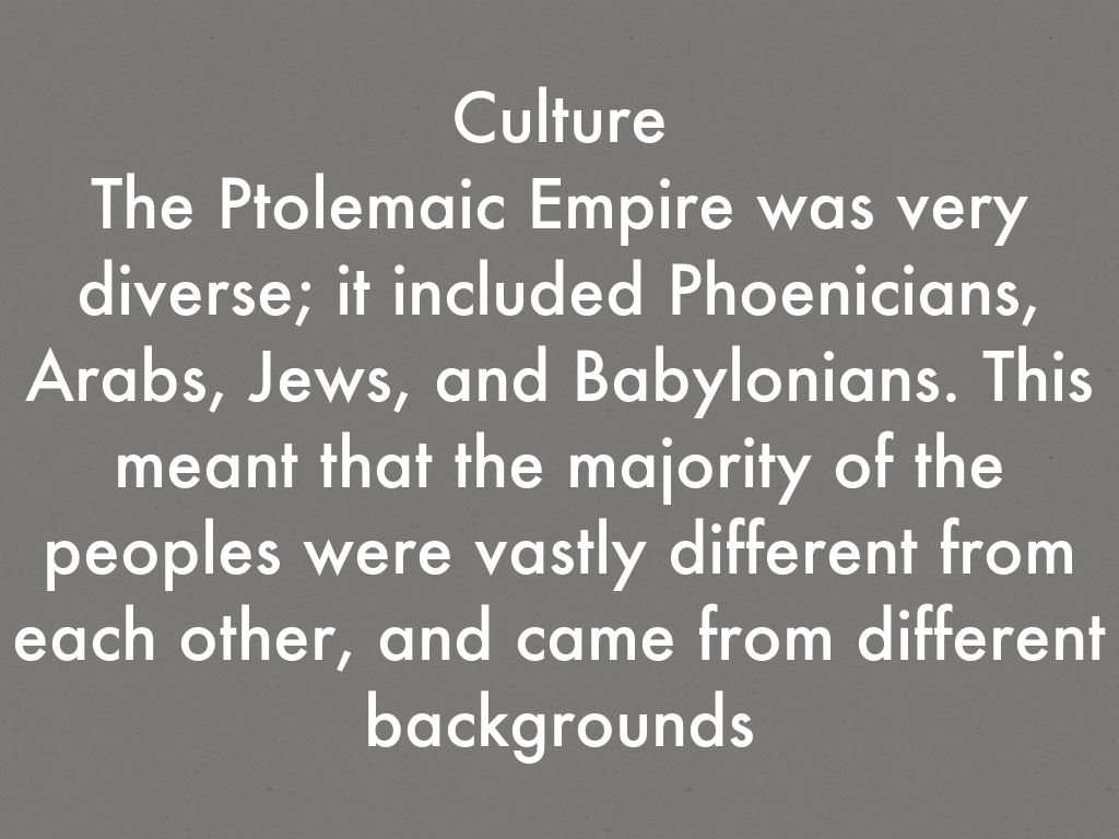 The Ptolemaic Empire was very diverse; it included Phoenicians, Arabs, Jews, and Babylonians. This meant that the majority of the peoples were vastly different from each other, and came from different backgrounds