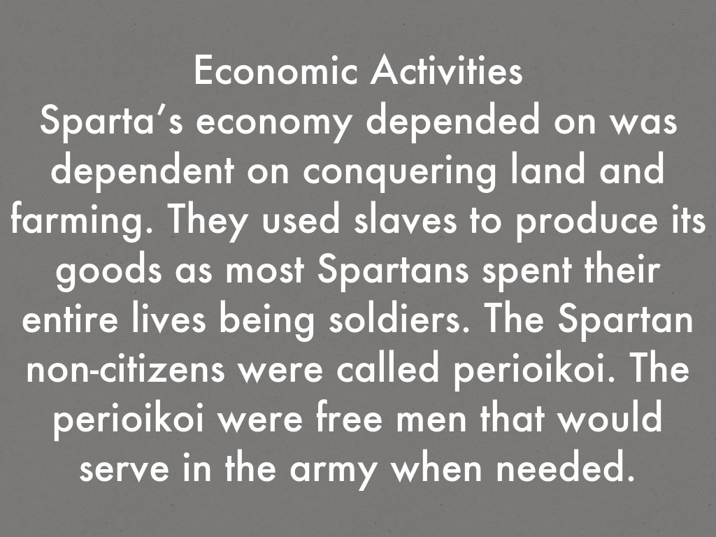 Sparta’s economy depended on was dependent on conquering land and farming. They used slaves to produce its goods as most Spartans spent their entire lives being soldiers. The Spartan non-citizens were called perioikoi. The perioikoi were free men that would serve in the army when needed.