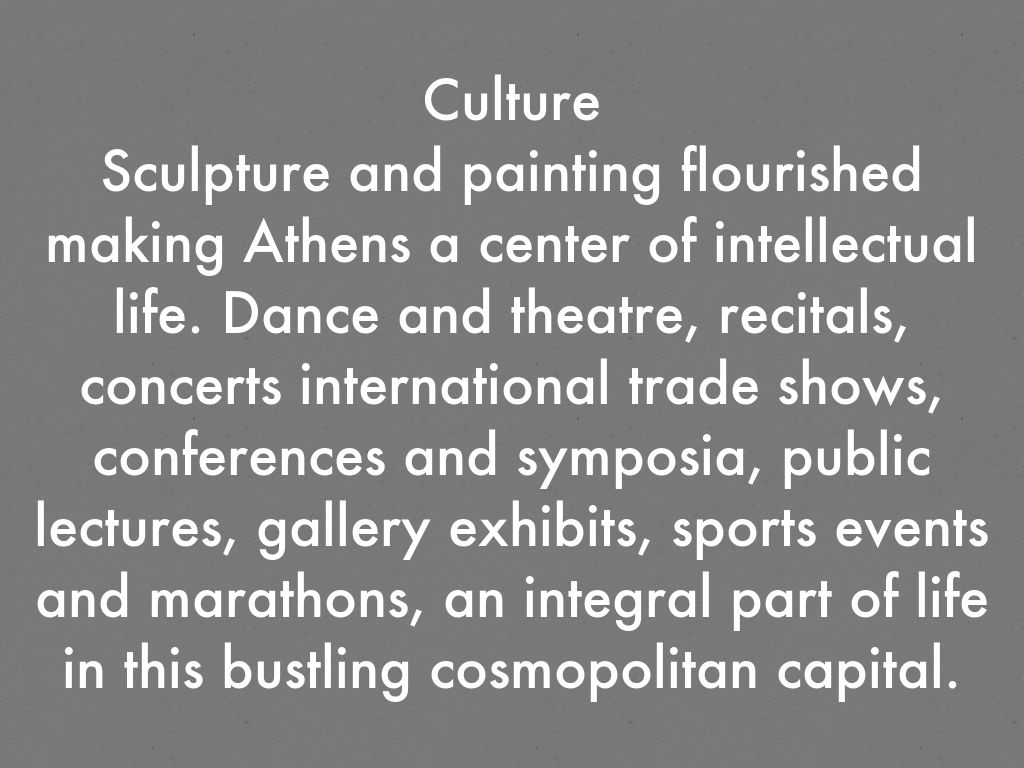 Sculpture and painting flourished making Athens a center of intellectual life. Dance and theatre, recitals, concerts international trade shows, conferences and symposia, public lectures, gallery exhibits, sports events and marathons, an integral part of life in this bustling cosmopolitan capital.