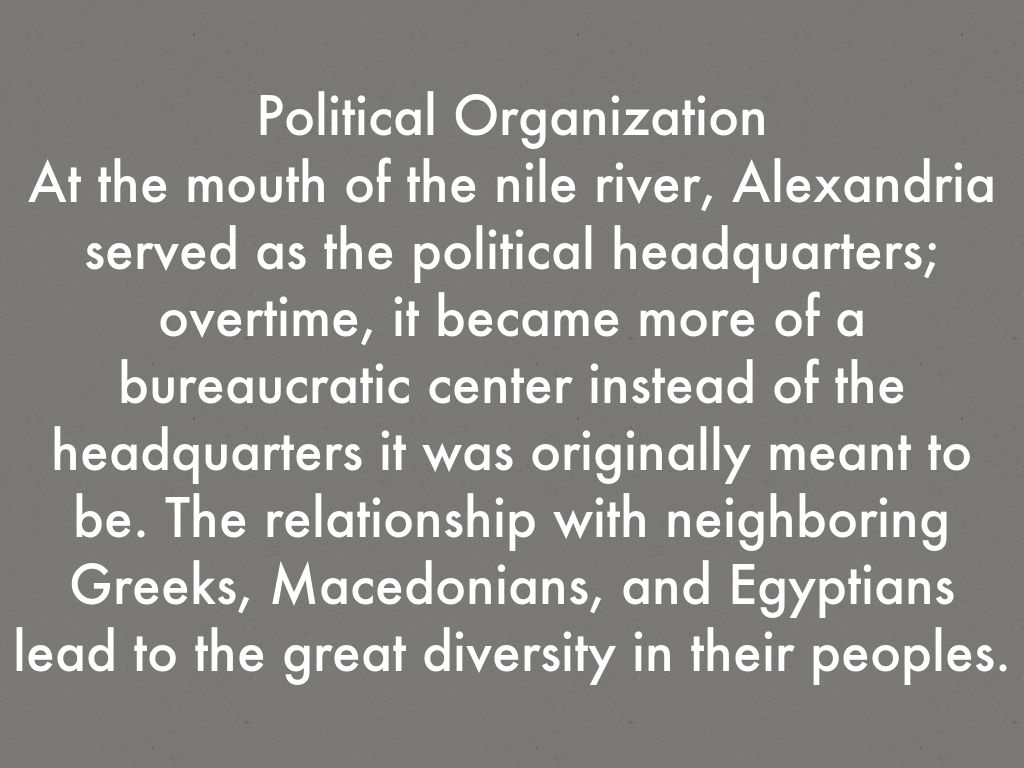 At the mouth of the nile river, Alexandria served as the political headquarters; overtime, it became more of a bureaucratic center instead of the headquarters it was originally meant to be. The relationship with neighboring Greeks, Macedonians, and Egyptians lead to the great diversity in their peoples.