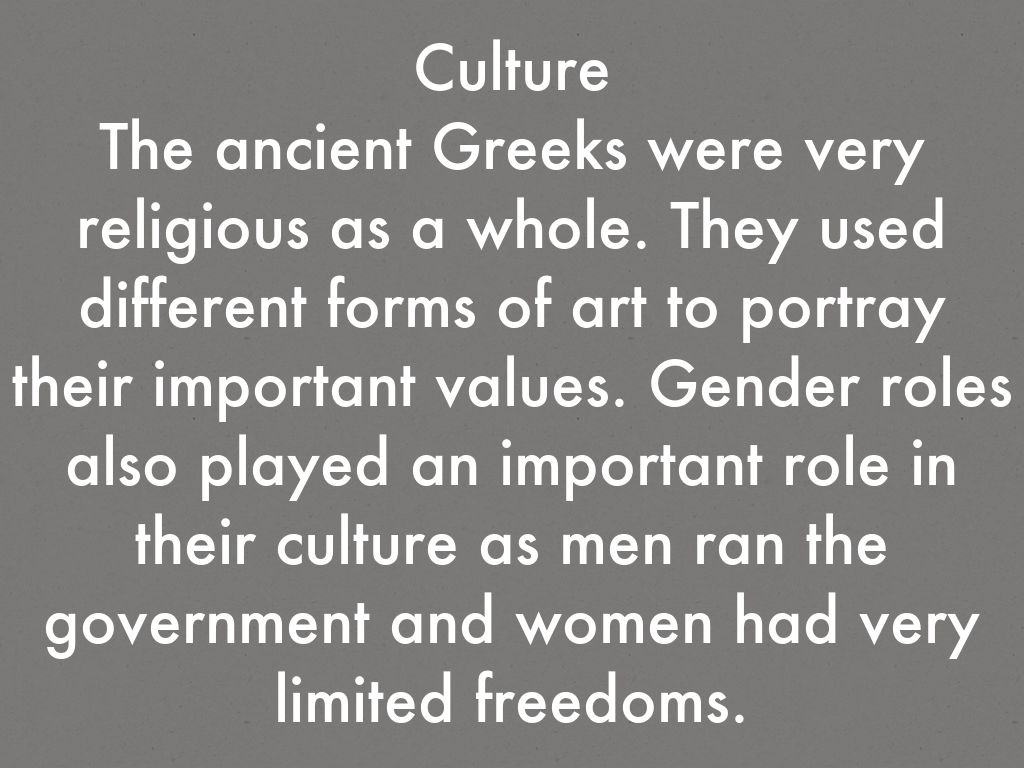 The ancient Greeks were very religious as a whole. They used different forms of art to portray their important values. Gender roles also played an important role in their culture as men ran the government and women had very limited freedoms.
