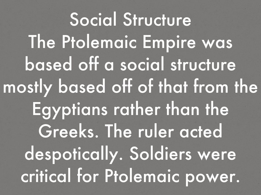 The Ptolemaic Empire was based off a social structure mostly based off of that from the Egyptians rather than the Greeks. The ruler acted despotically. Soldiers were critical for Ptolemaic power.