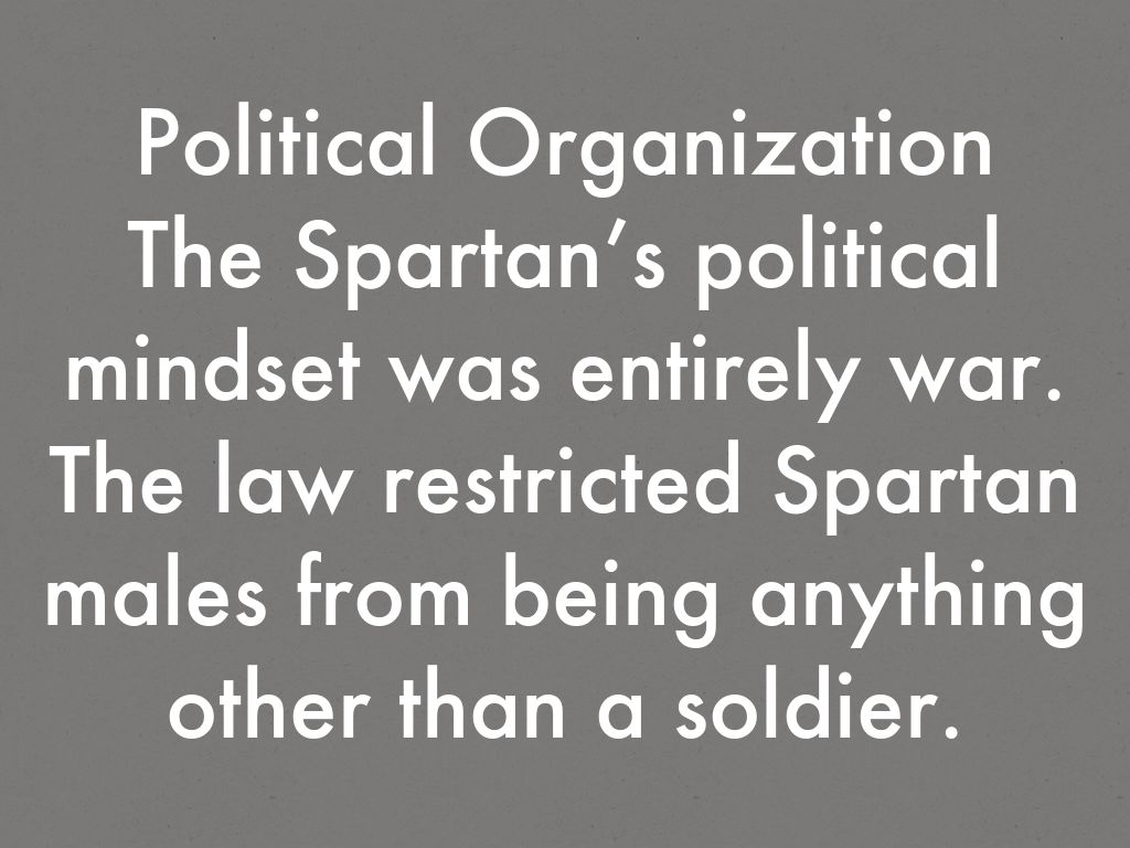 The Spartan’s political mindset was entirely war. The law restricted Spartan males from being anything other than a soldier.