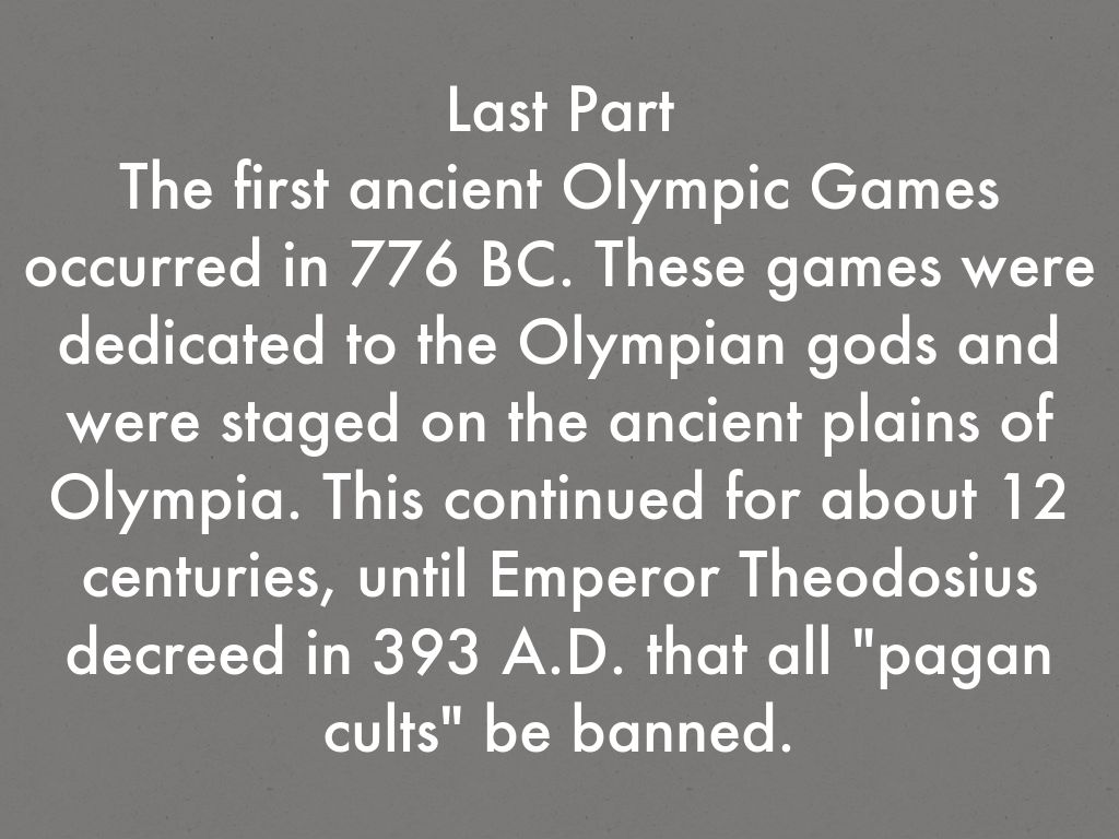 The first ancient Olympic Games occurred in 776 BC. These games were dedicated to the Olympian gods and were staged on the ancient plains of Olympia. This continued for about 12 centuries, until Emperor Theodosius decreed in 393 A.D. that all "pagan cults" be banned.