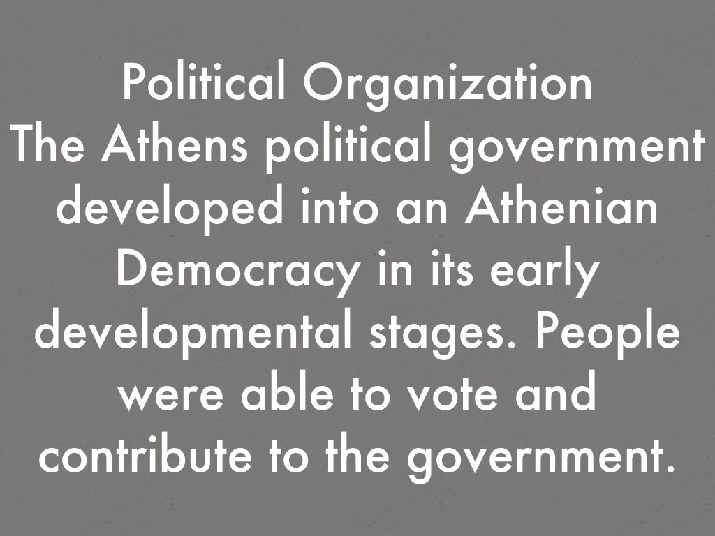 The Athens political government developed into an Athenian Democracy in its early developmental stages. People were able to vote and contribute to the government.