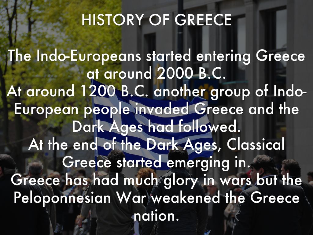 The Indo-Europeans started entering Greece at around 2000 B.C. At around 1200 B.C. another group of Indo-European people invaded Greece and the Dark Ages had followed. At the end of the Dark Ages, Classical Greece started emerging in. Greece has had much glory in wars but the Peloponnesian War weakened the Greece nation.