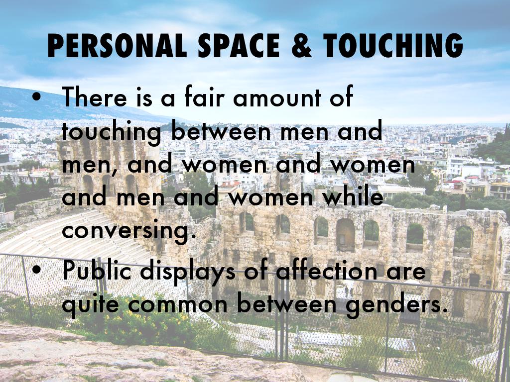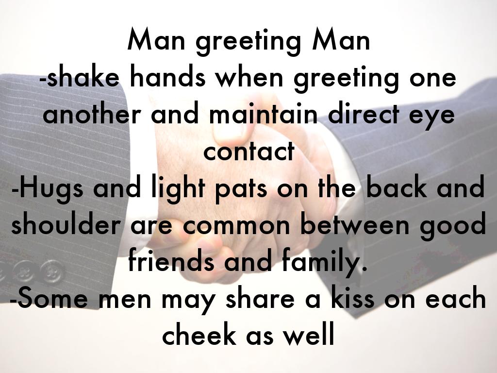 Man greeting Man -shake hands when greeting one another and maintain direct eye contact -Hugs and light pats on the back and shoulder are common between good friends and family. -Some men may share a kiss on each cheek as well
