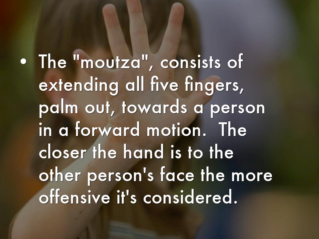 The "moutza", consists of extending all five fingers, palm out, towards a person in a forward motion. The closer the hand is to the other person's face the more offensive it's considered.