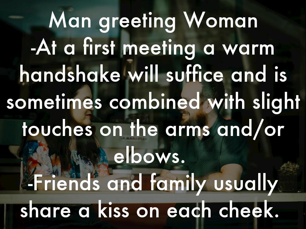Man greeting Woman -At a first meeting a warm handshake will suffice and is sometimes combined with slight touches on the arms and/or elbows. -Friends and family usually share a kiss on each cheek.