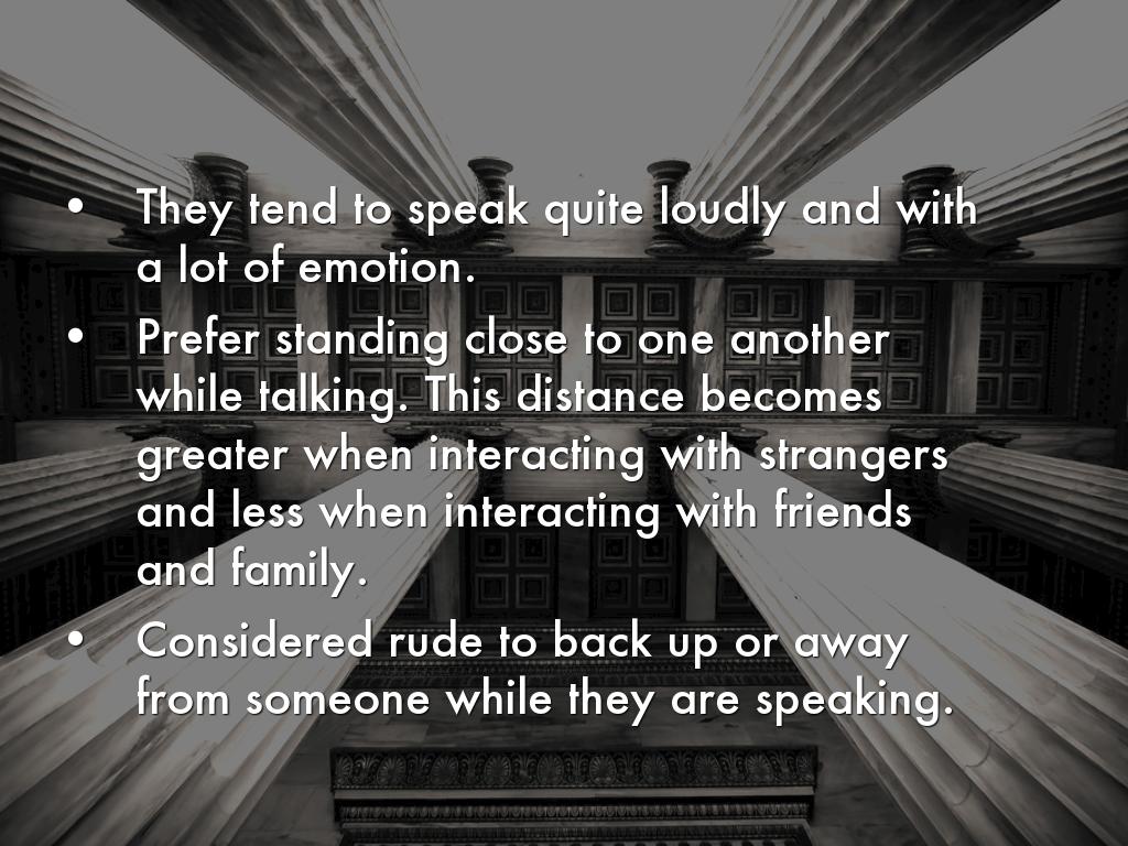 Prefer standing close to one another while talking. This distance becomes greater when interacting with strangers and less when interacting with friends and family.