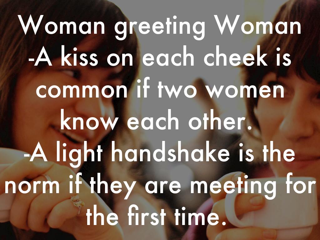 Woman greeting Woman -A kiss on each cheek is common if two women know each other. -A light handshake is the norm if they are meeting for the first time.