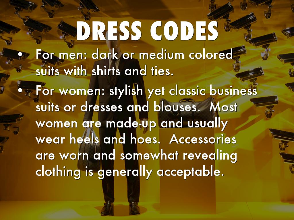 For women: stylish yet classic business suits or dresses and blouses. Most women are made-up and usually wear heels and hoes. Accessories are worn and somewhat revealing clothing is generally acceptable.