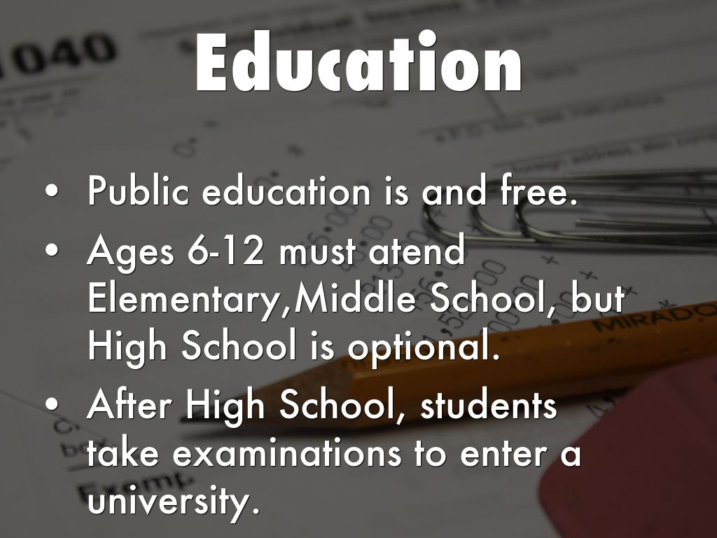 Ages 6-12 must atend Elementary,Middle School, but High School is optional.