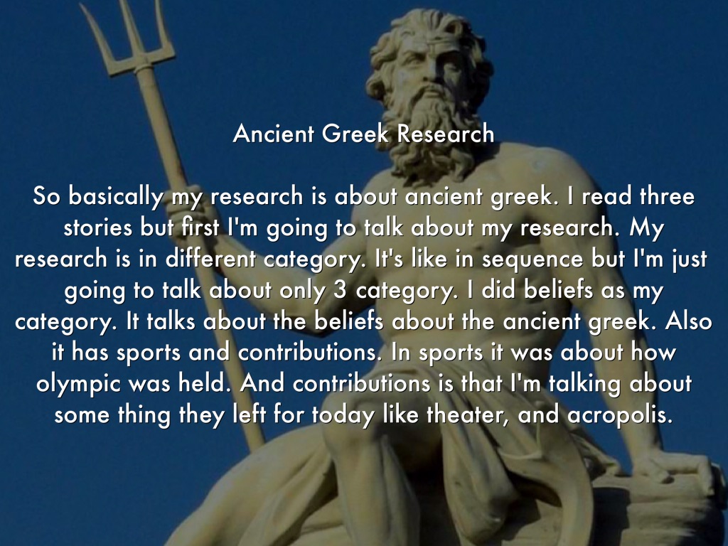 So basically my research is about ancient greek. I read three stories but first I'm going to talk about my research. My research is in different category. It's like in sequence but I'm just going to talk about only 3 category. I did beliefs as my category. It talks about the beliefs about the ancient greek. Also it has sports and contributions. In sports it was about how olympic was held. And contributions is that I'm talking about some thing they left for today like theater, and acropolis.