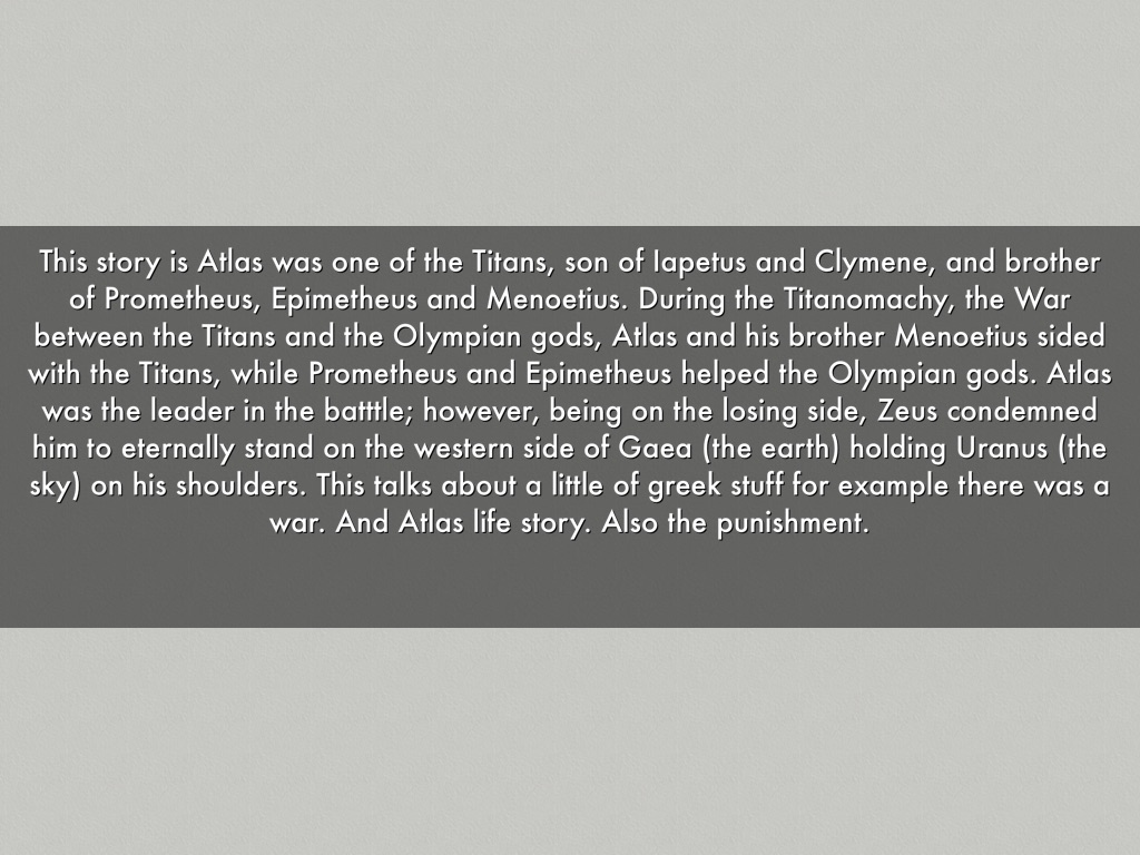 This story is Atlas was one of the Titans, son of Iapetus and Clymene, and brother of Prometheus, Epimetheus and Menoetius. During the Titanomachy, the War between the Titans and the Olympian gods, Atlas and his brother Menoetius sided with the Titans, while Prometheus and Epimetheus helped the Olympian gods. Atlas was the leader in the batttle; however, being on the losing side, Zeus condemned him to eternally stand on the western side of Gaea (the earth) holding Uranus (the sky) on his shoulders. This talks about a little of greek stuff for example there was a war. And Atlas life story. Also the punishment.
