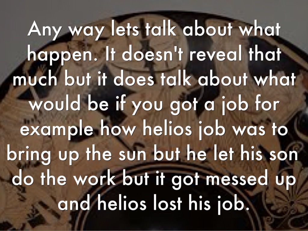 Any way lets talk about what happen. It doesn't reveal that much but it does talk about what would be if you got a job for example how helios job was to bring up the sun but he let his son do the work but it got messed up and helios lost his job.