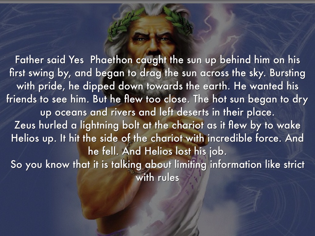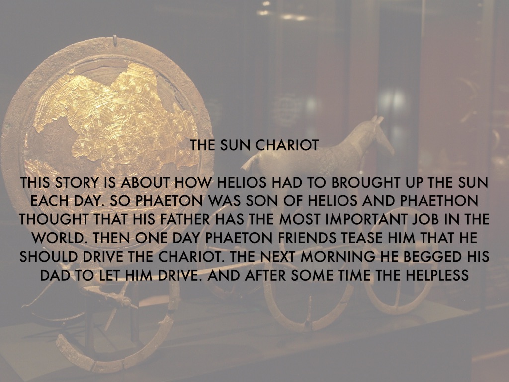 THIS STORY IS ABOUT HOW HELIOS HAD TO BROUGHT UP THE SUN EACH DAY. SO PHAETON WAS SON OF HELIOS AND PHAETHON THOUGHT THAT HIS FATHER HAS THE MOST IMPORTANT JOB IN THE WORLD. THEN ONE DAY PHAETON FRIENDS TEASE HIM THAT HE SHOULD DRIVE THE CHARIOT. THE NEXT MORNING HE BEGGED HIS DAD TO LET HIM DRIVE. AND AFTER SOME TIME THE HELPLESS