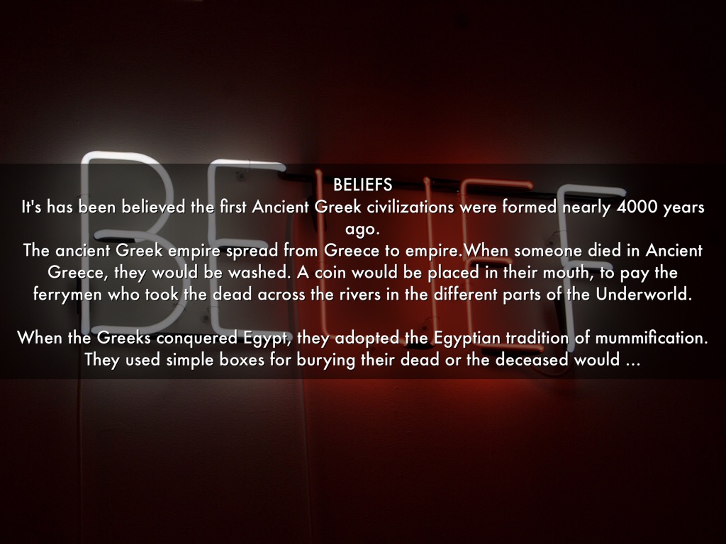 The ancient Greek empire spread from Greece to empire.When someone died in Ancient Greece, they would be washed. A coin would be placed in their mouth, to pay the ferrymen who took the dead across the rivers in the different parts of the Underworld.