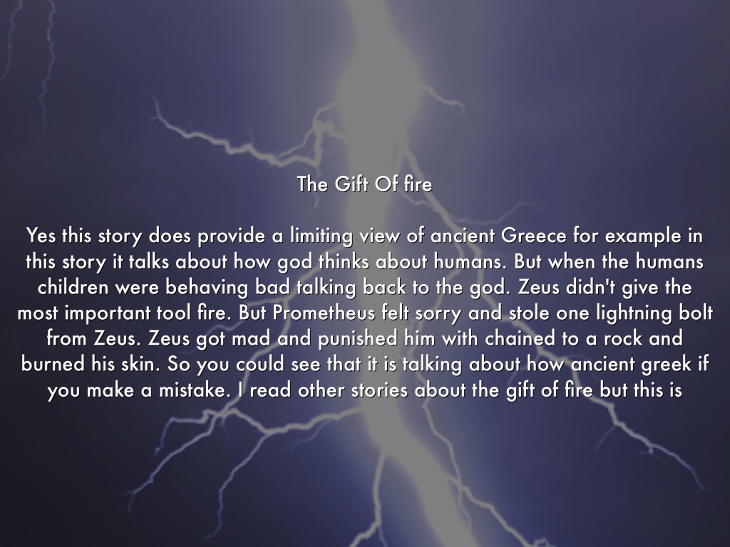 Yes this story does provide a limiting view of ancient Greece for example in this story it talks about how god thinks about humans. But when the humans children were behaving bad talking back to the god. Zeus didn't give the most important tool fire. But Prometheus felt sorry and stole one lightning bolt from Zeus. Zeus got mad and punished him with chained to a rock and burned his skin. So you could see that it is talking about how ancient greek if you make a mistake. I read other stories about the gift of fire but this is