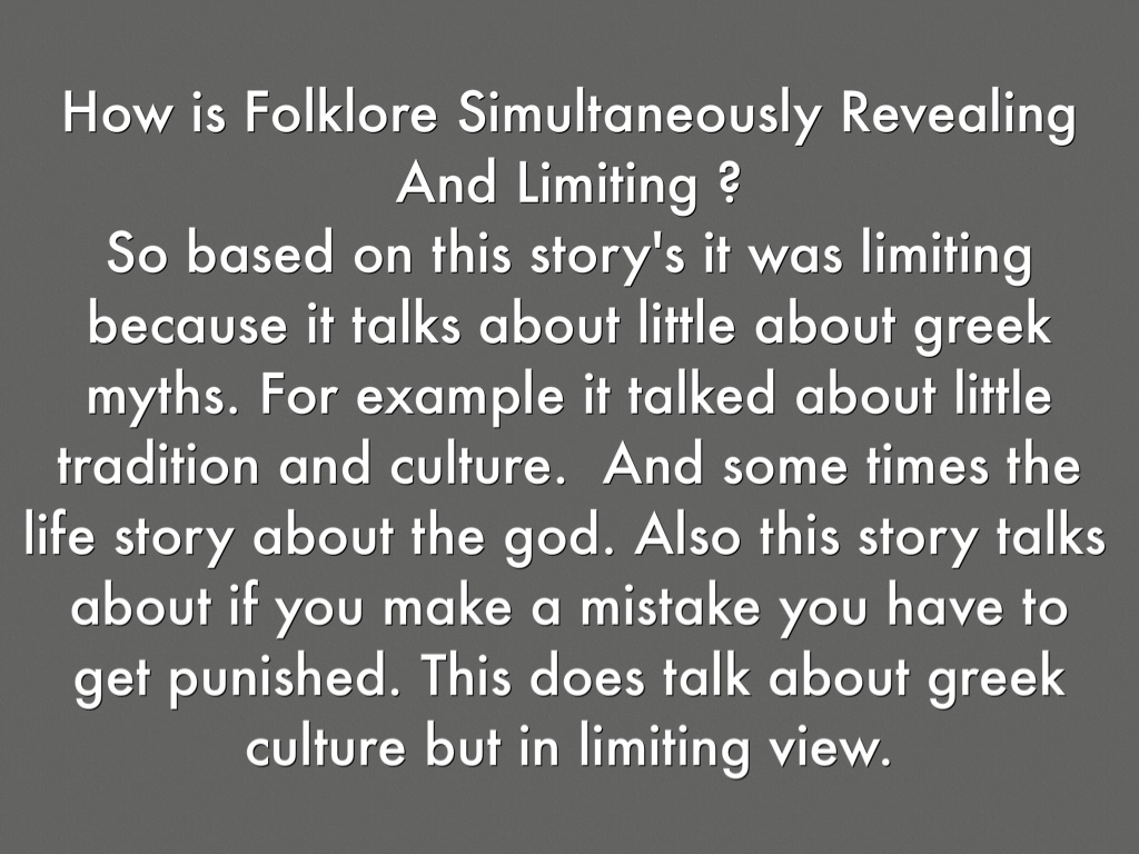 So based on this story's it was limiting because it talks about little about greek myths. For example it talked about little tradition and culture. And some times the life story about the god. Also this story talks about if you make a mistake you have to get punished. This does talk about greek culture but in limiting view.