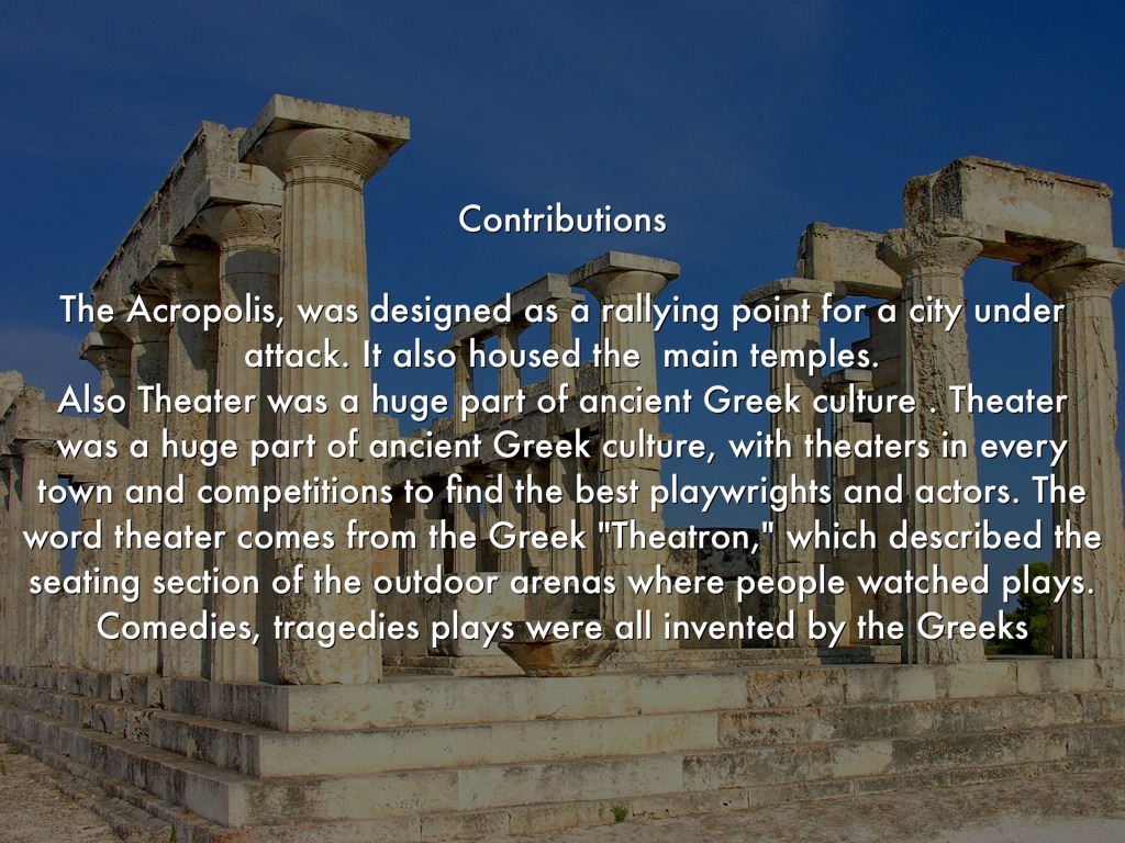 Also Theater was a huge part of ancient Greek culture . Theater was a huge part of ancient Greek culture, with theaters in every town and competitions to find the best playwrights and actors. The word theater comes from the Greek "Theatron," which described the seating section of the outdoor arenas where people watched plays. Comedies, tragedies plays were all invented by the Greeks