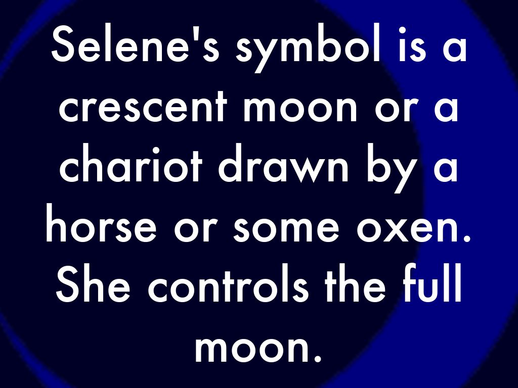 Selene's symbol is a crescent moon or a chariot drawn by a horse or some oxen. She controls the full moon.