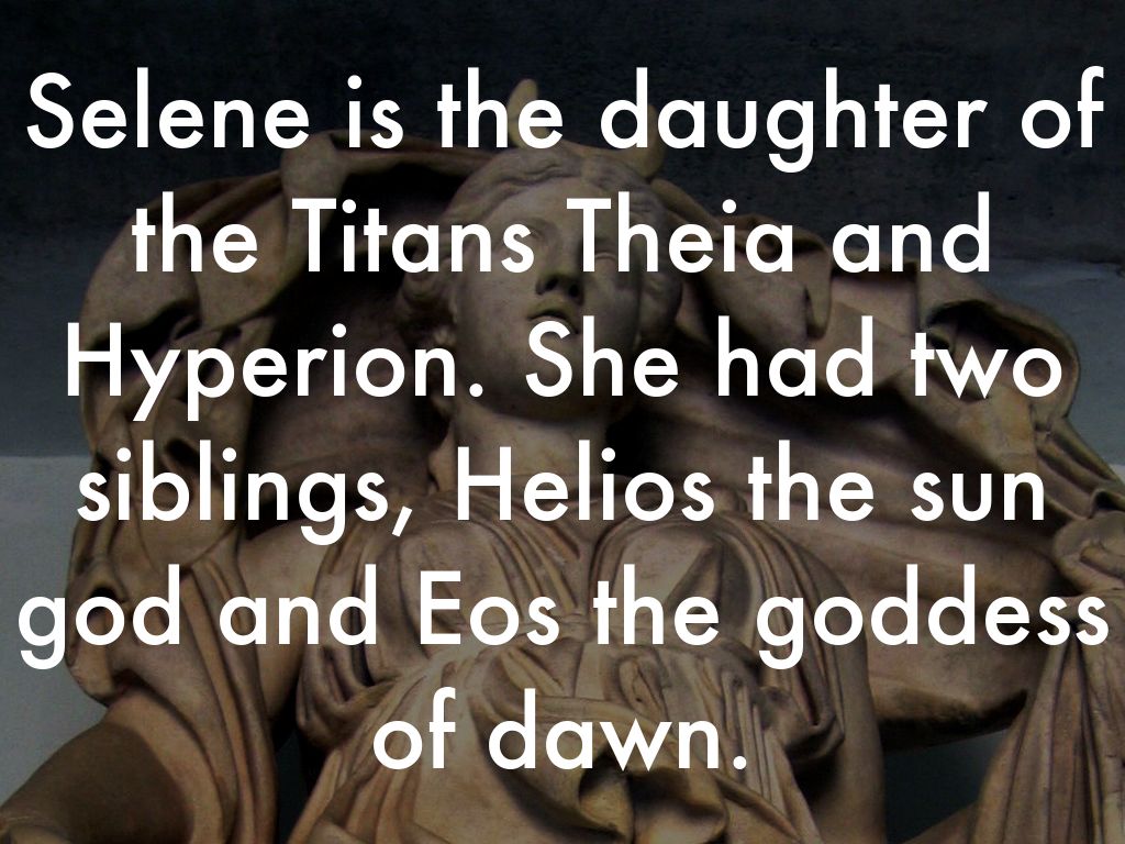 Selene is the daughter of the Titans Theia and Hyperion. She had two siblings, Helios the sun god and Eos the goddess of dawn.