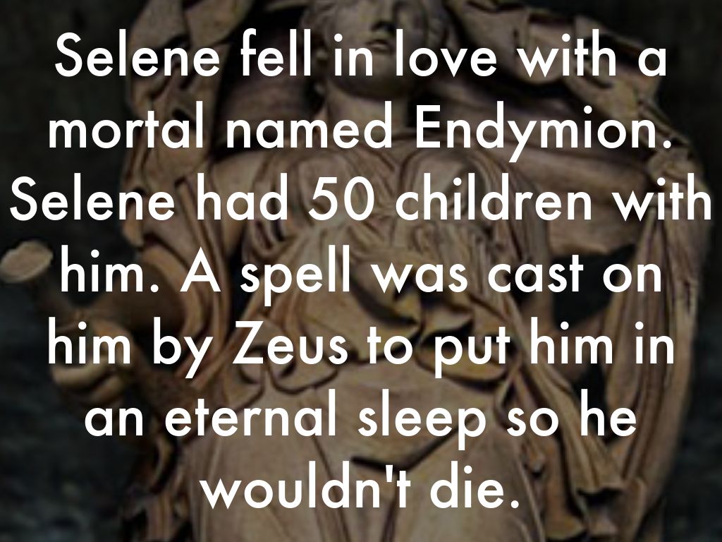 Selene fell in love with a mortal named Endymion. Selene had 50 children with him. A spell was cast on him by Zeus to put him in an eternal sleep so he wouldn't die.