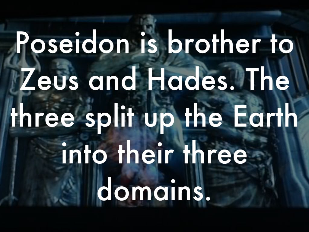 Poseidon is brother to Zeus and Hades. The three split up the Earth into their three domains.