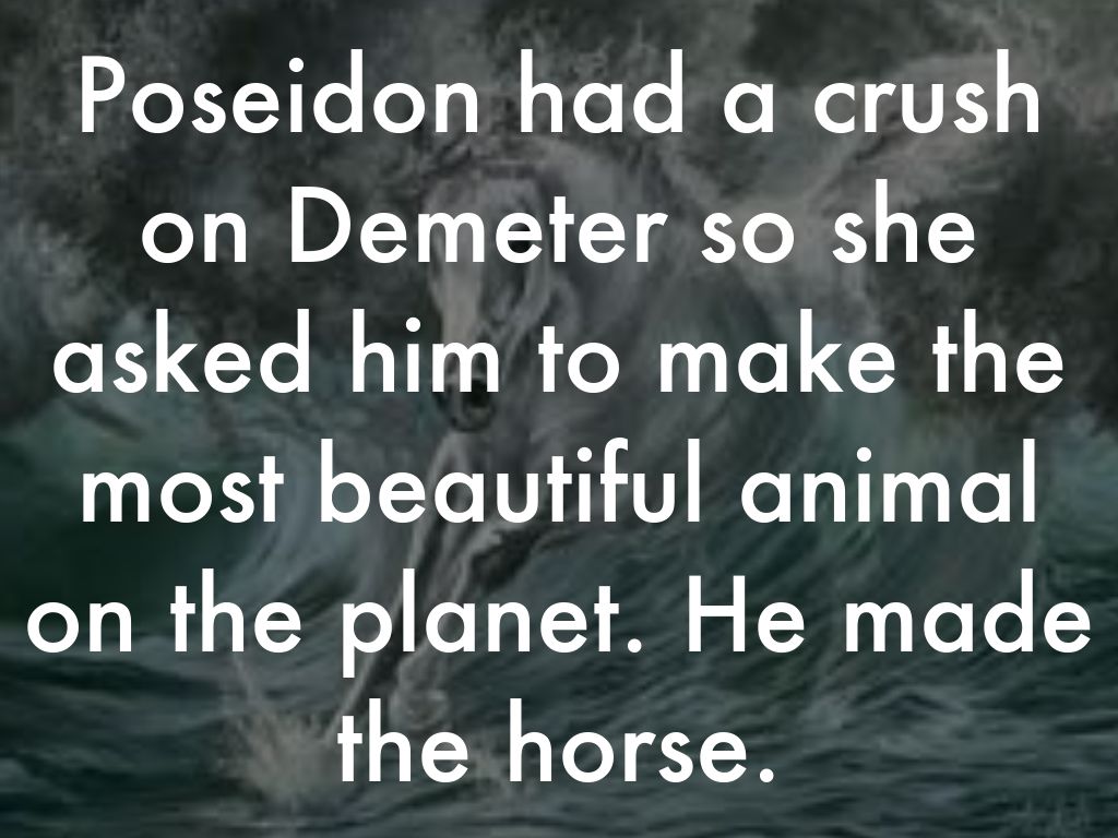 Poseidon had a crush on Demeter so she asked him to make the most beautiful animal on the planet. He made the horse.
