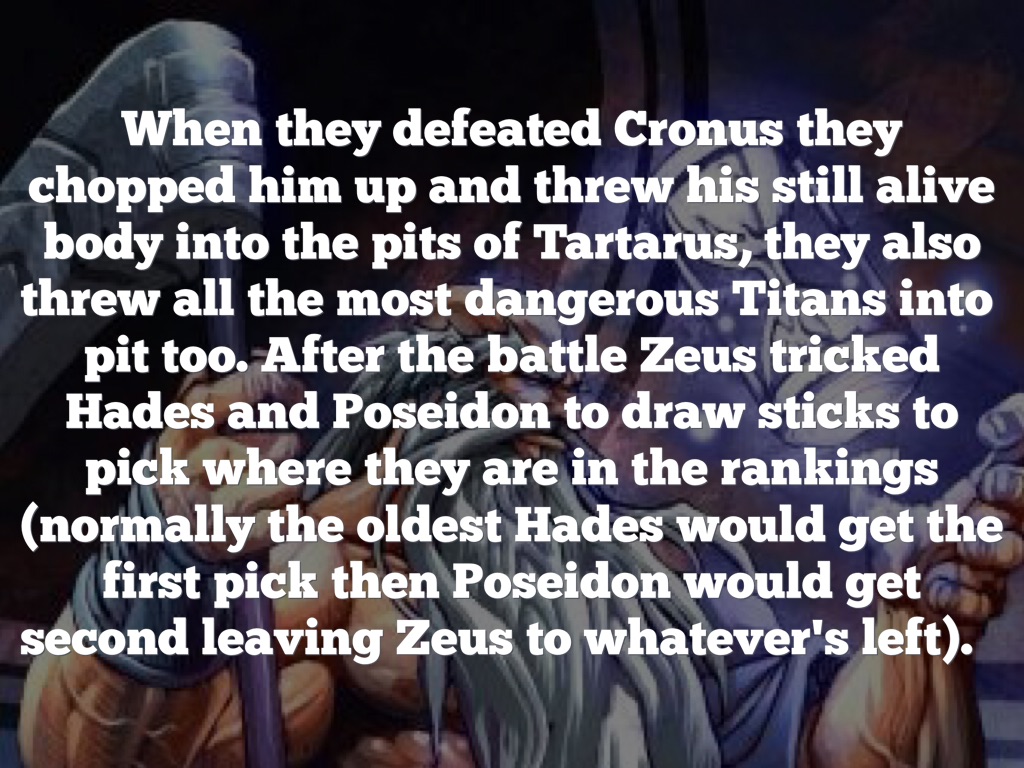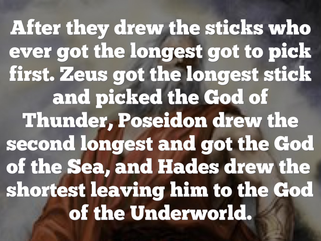After they drew the sticks who ever got the longest got to pick first. Zeus got the longest stick and picked the God of Thunder, Poseidon drew the second longest and got the God of the Sea, and Hades drew the shortest leaving him to the God of the Underworld.