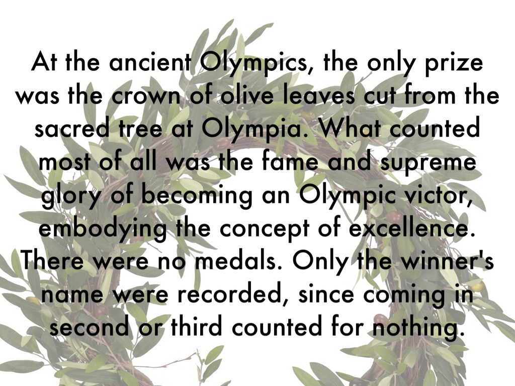 At the ancient Olympics, the only prize was the crown of olive leaves cut from the sacred tree at Olympia. What counted most of all was the fame and supreme glory of becoming an Olympic victor, embodying the concept of excellence. There were no medals. Only the winner's name were recorded, since coming in second or third counted for nothing.