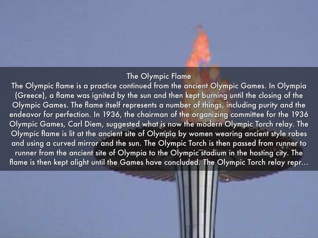 The Olympic flame is a practice continued from the ancient Olympic Games. In Olympia (Greece), a flame was ignited by the sun and then kept burning until the closing of the Olympic Games. The flame itself represents a number of things, including purity and the endeavor for perfection. In 1936, the chairman of the organizing committee for the 1936 Olympic Games, Carl Diem, suggested what is now the modern Olympic Torch relay. The Olympic flame is lit at the ancient site of Olympia by women wearing ancient style robes and using a curved mirror and the sun. The Olympic Torch is then passed from runner to runner from the ancient site of Olympia to the Olympic stadium in the hosting city. The flame is then kept alight until the Games have concluded. The Olympic Torch relay represents a continuation from the ancient Olympic Games to the modern Olympics.
