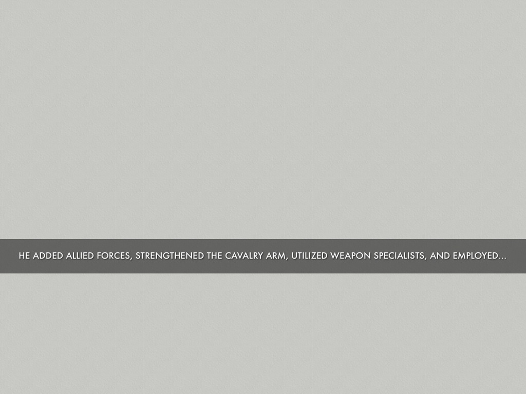 HE ADDED ALLIED FORCES, STRENGTHENED THE CAVALRY ARM, UTILIZED WEAPON SPECIALISTS, AND EMPLOYED CORPS OF ENGINEERS.
