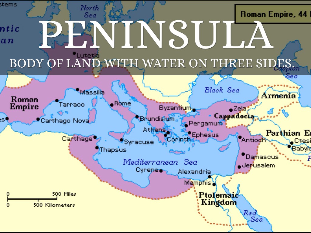 BODY OF LAND WITH WATER ON THREE SIDES.