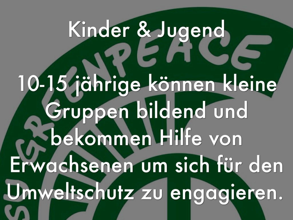 10-15 jährige können kleine Gruppen bildend und bekommen Hilfe von Erwachsenen um sich für den Umweltschutz zu engagieren.