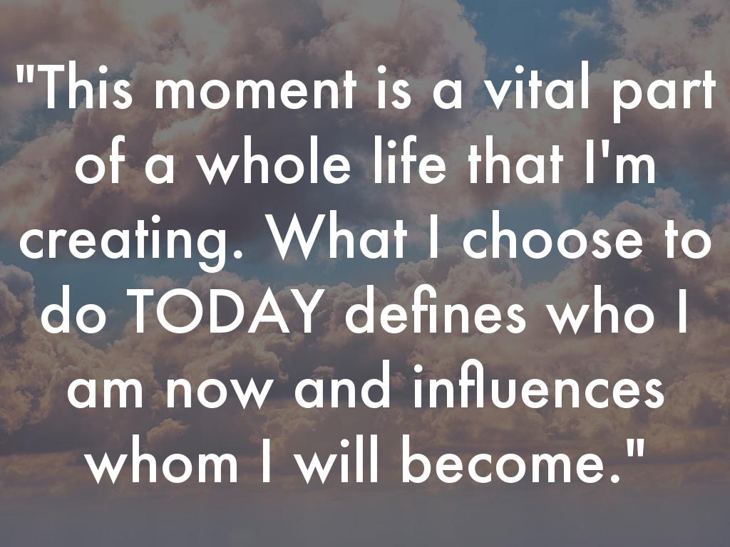 "This moment is a vital part of a whole life that I'm creating. What I choose to do TODAY defines who I am now and influences whom I will become."