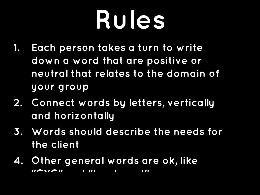 Each person takes a turn to write down a word that are positive or neutral that relates to the domain of your group