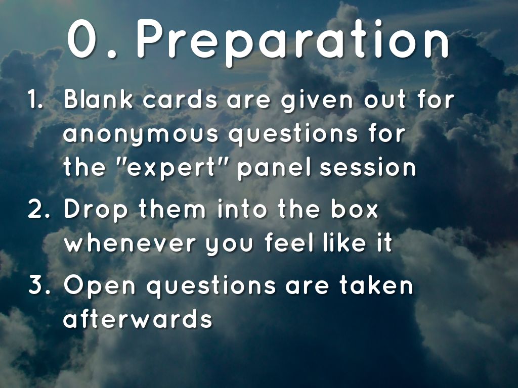 Blank cards are given out for anonymous questions for the "expert" panel session