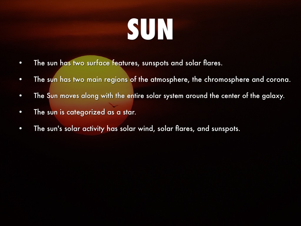 The sun's solar activity has solar wind, solar flares, and sunspots.